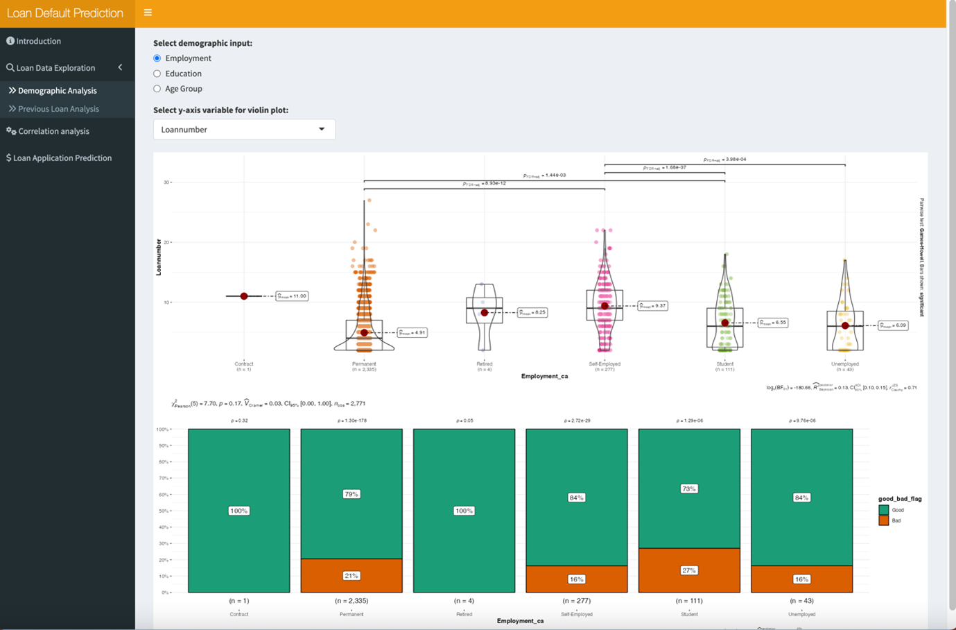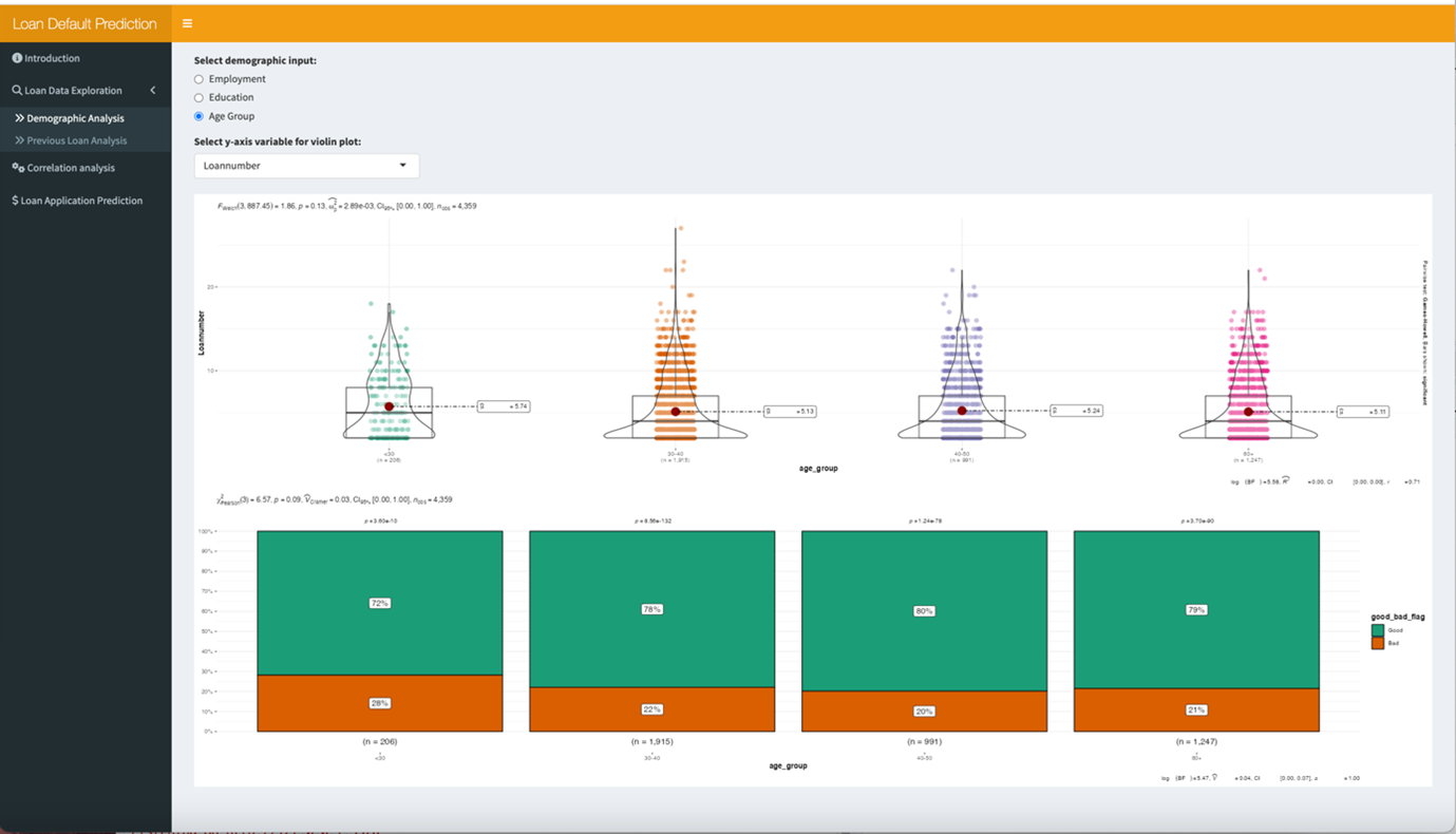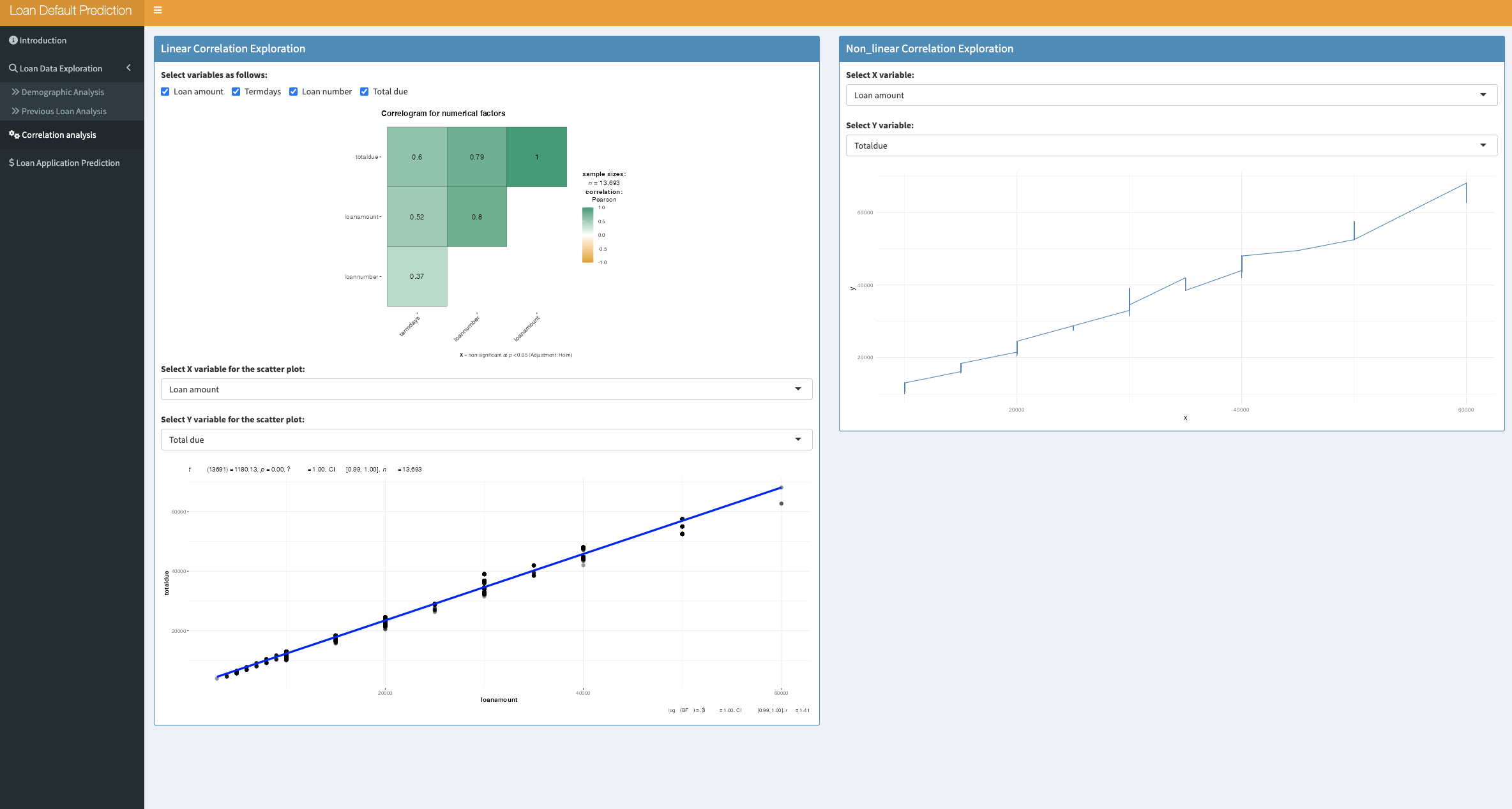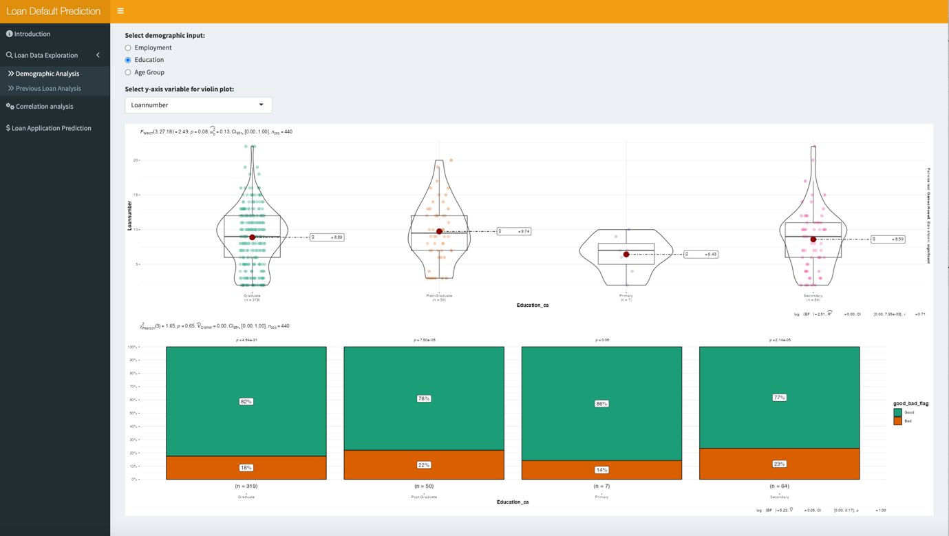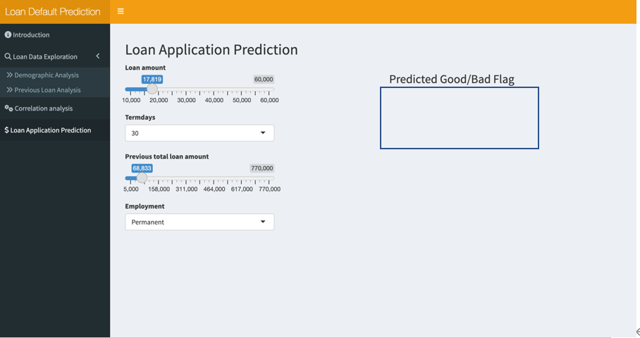 [1]In Loan Application Prediction tab ,users could input the following information :loan amount, termdays, previous total loan amount, employment to predict the loan repay status from the sliderpanel or selectpanel;