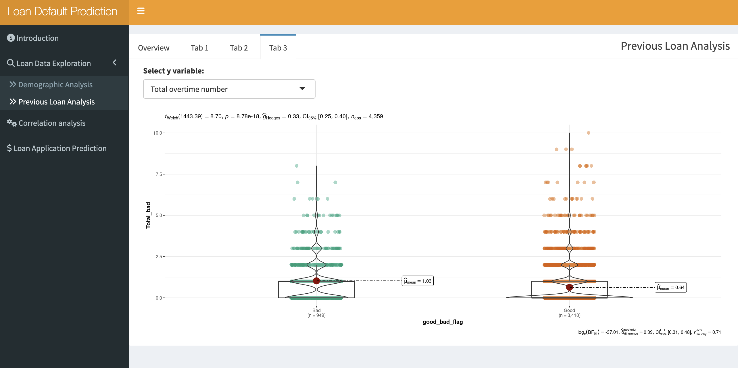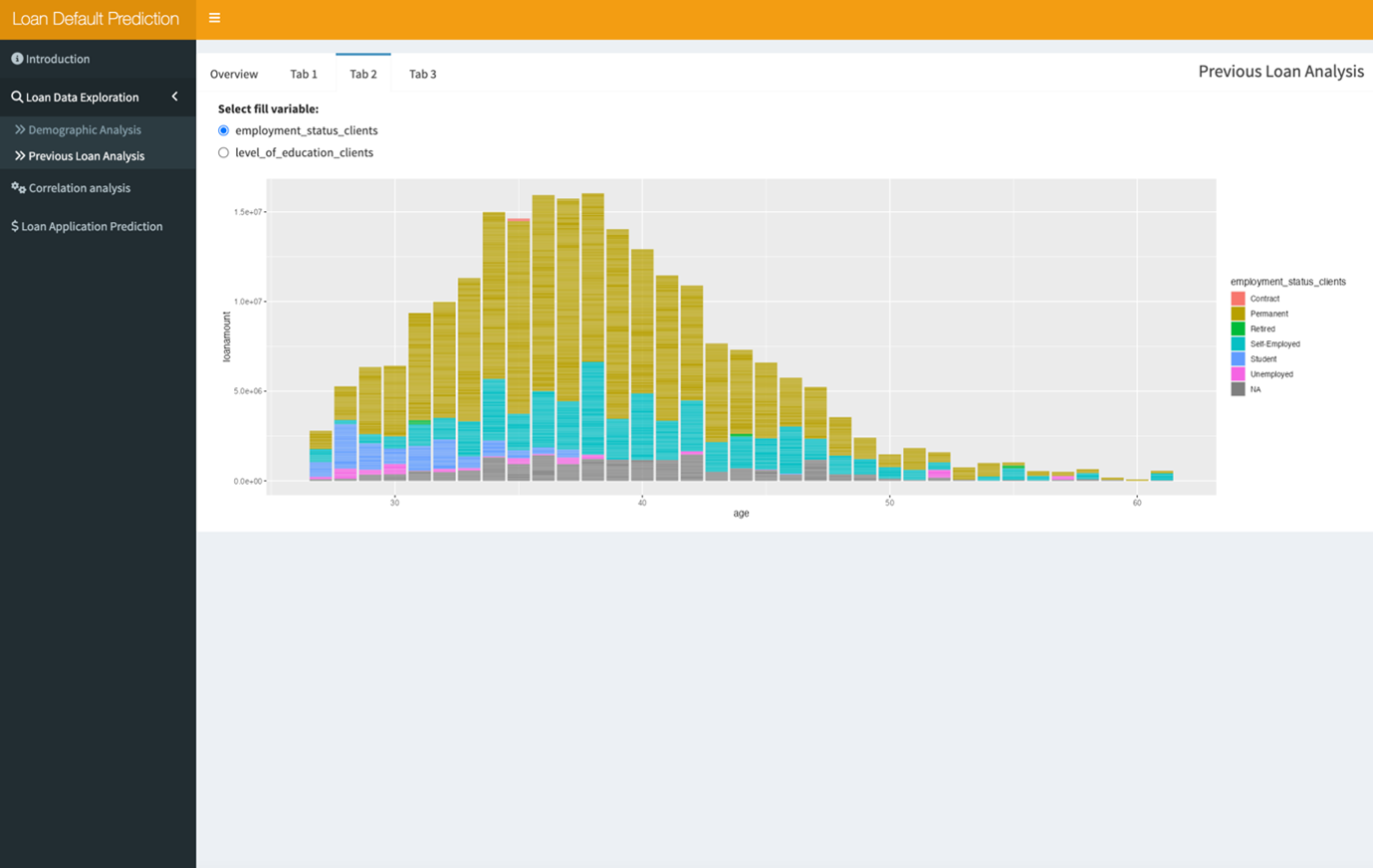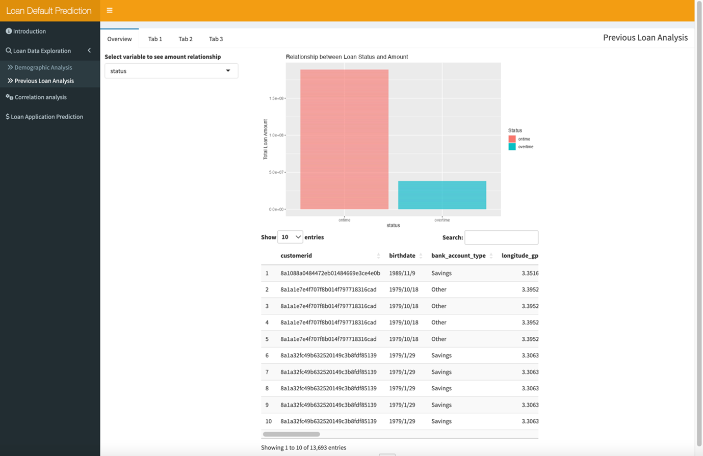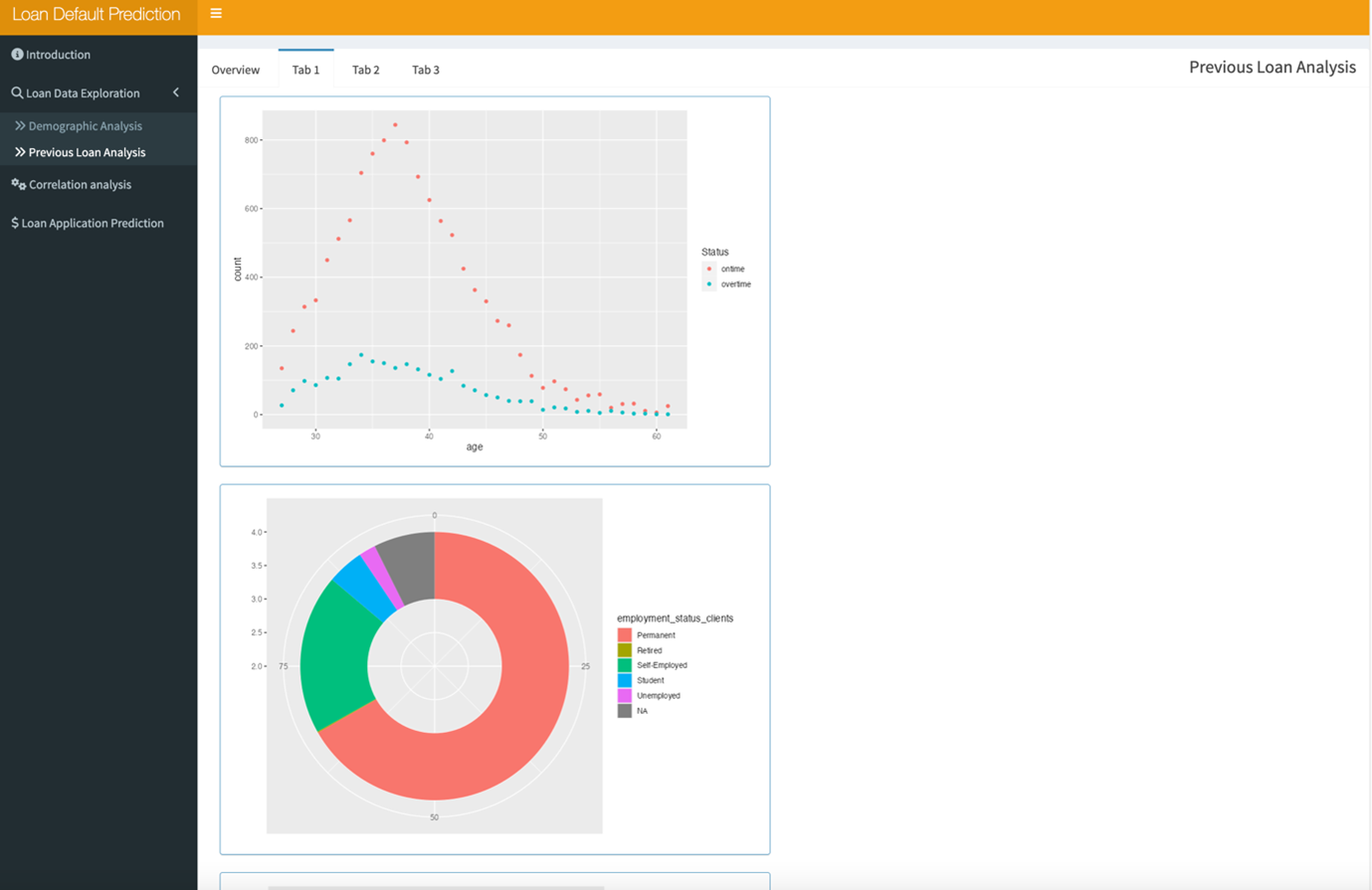 The previous loan analysis has 4 tabs: Overview, tab1, tab2, tab3. Each has its own function.